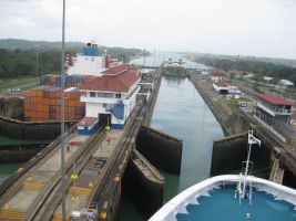 A must-see destination - Panama Canal. Island Princess being guided by locomotives (right side of the photo) through Gatun Lock, the first set of locks on Atlantic side,toward Gatun Lake side. There is a three step process that lifts the ship 85’ above sea lever to the level of Gatun Lake. Gat;un Lake is maintained at 85’ above sea level by design of the dam and weather conditions.